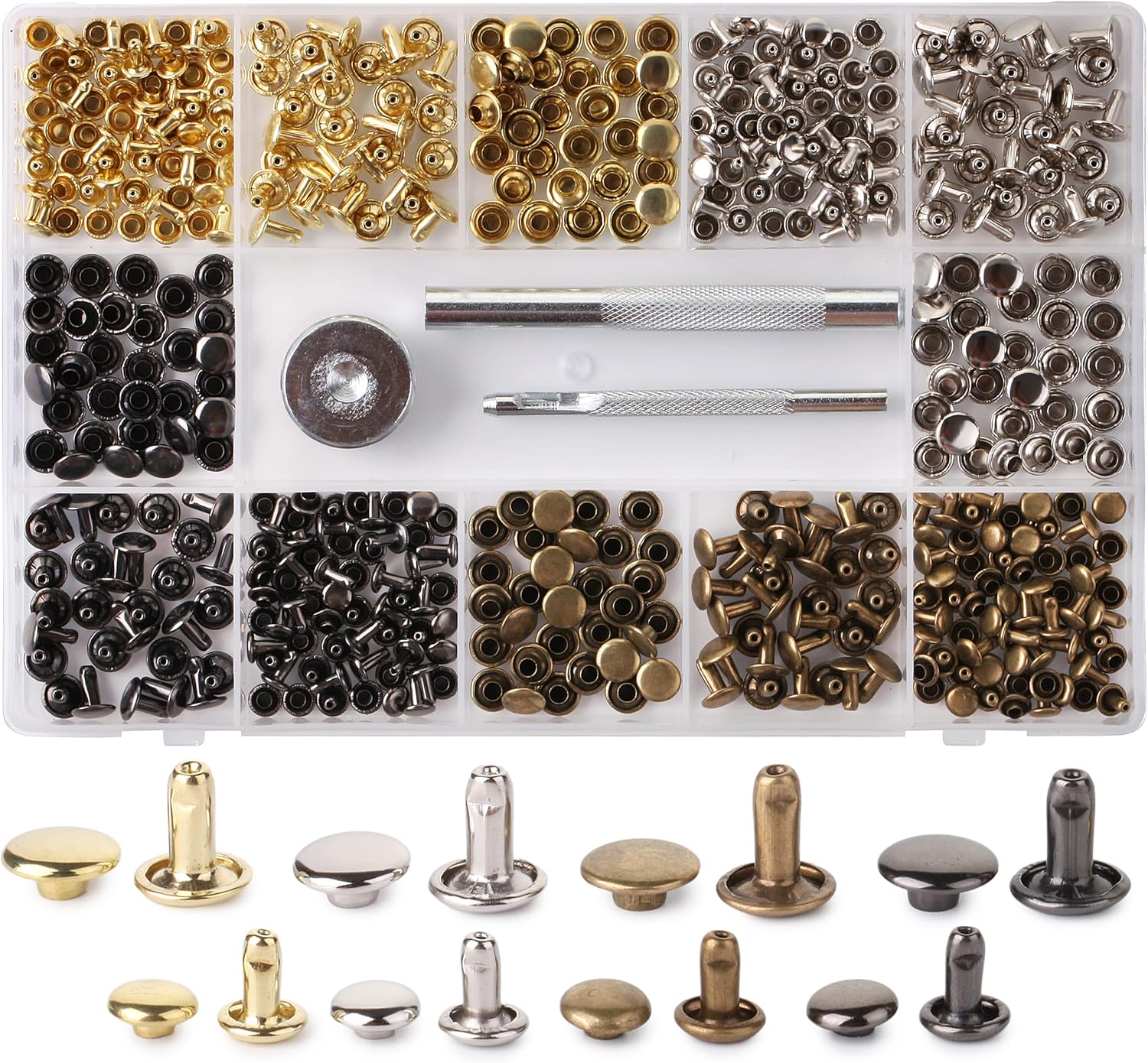 UNCO- Leather Rivets Kit, 4 Colors, 2 Sizes, 240 pcs, Tubular Metal Studs with Fixing Tools, Double Cap Rivets, Rivets for Leather, Rivets for Fabric, Leather Hardware Supplies.